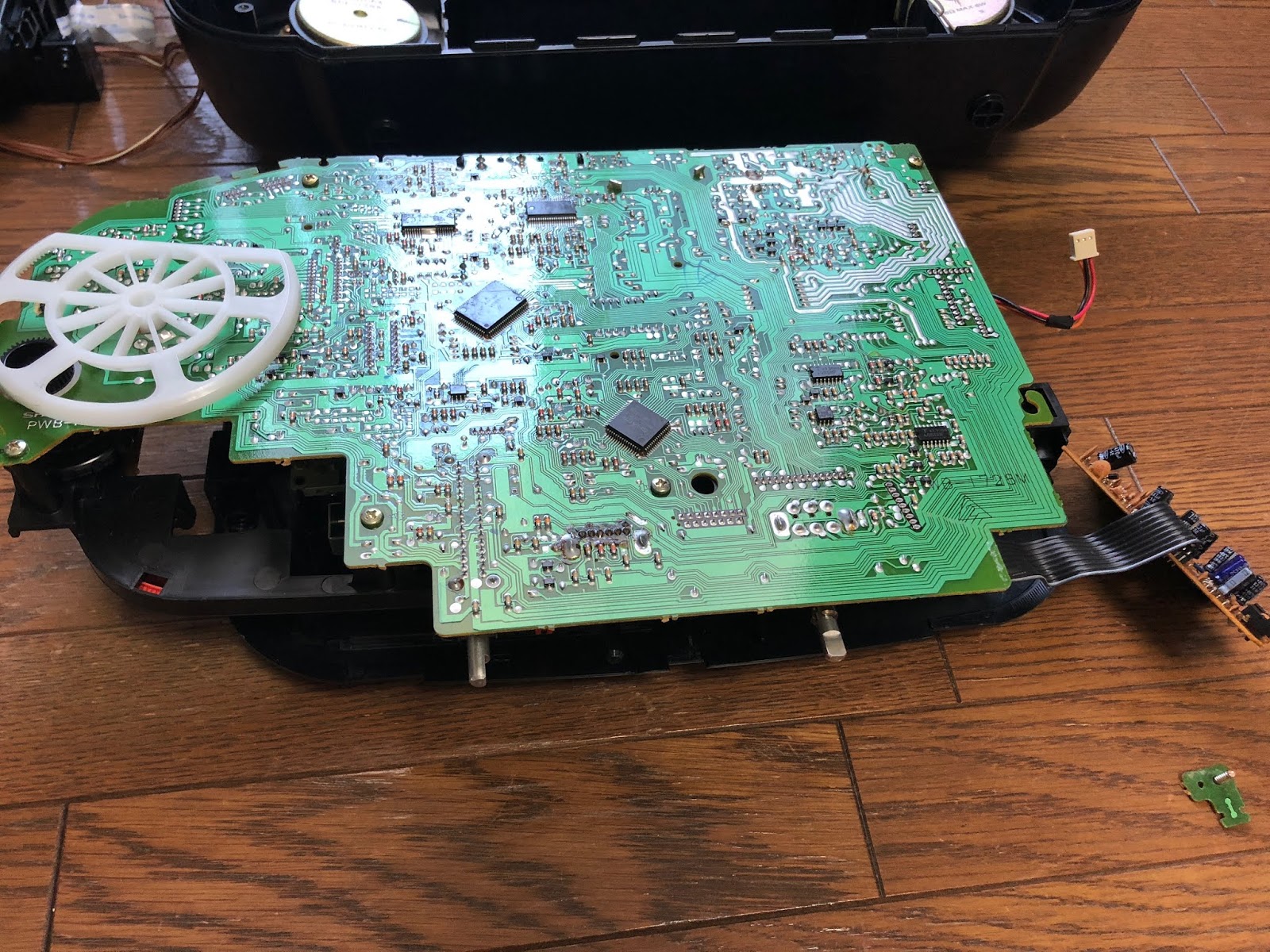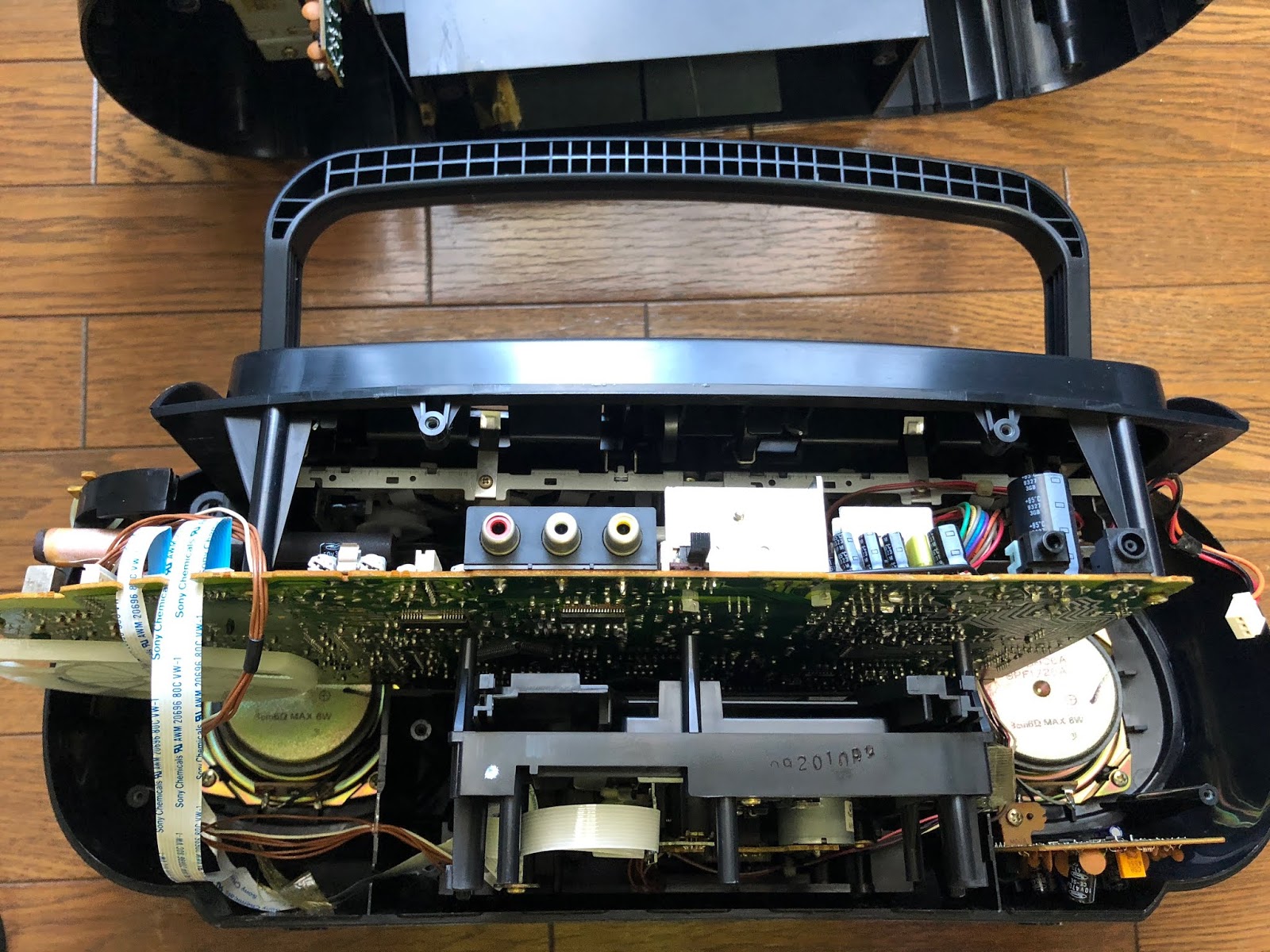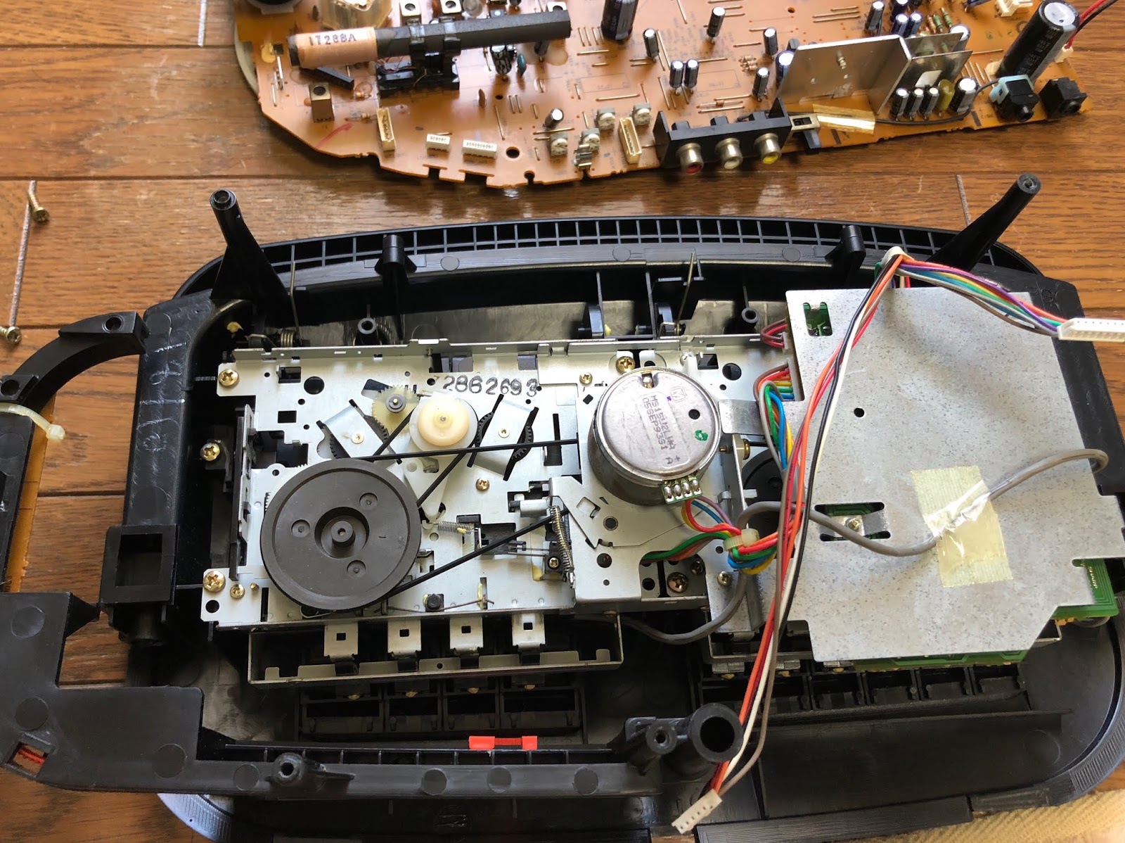 本体の上に面する部分にメイン基板、カセットデッキが付いています。この基盤も外します!