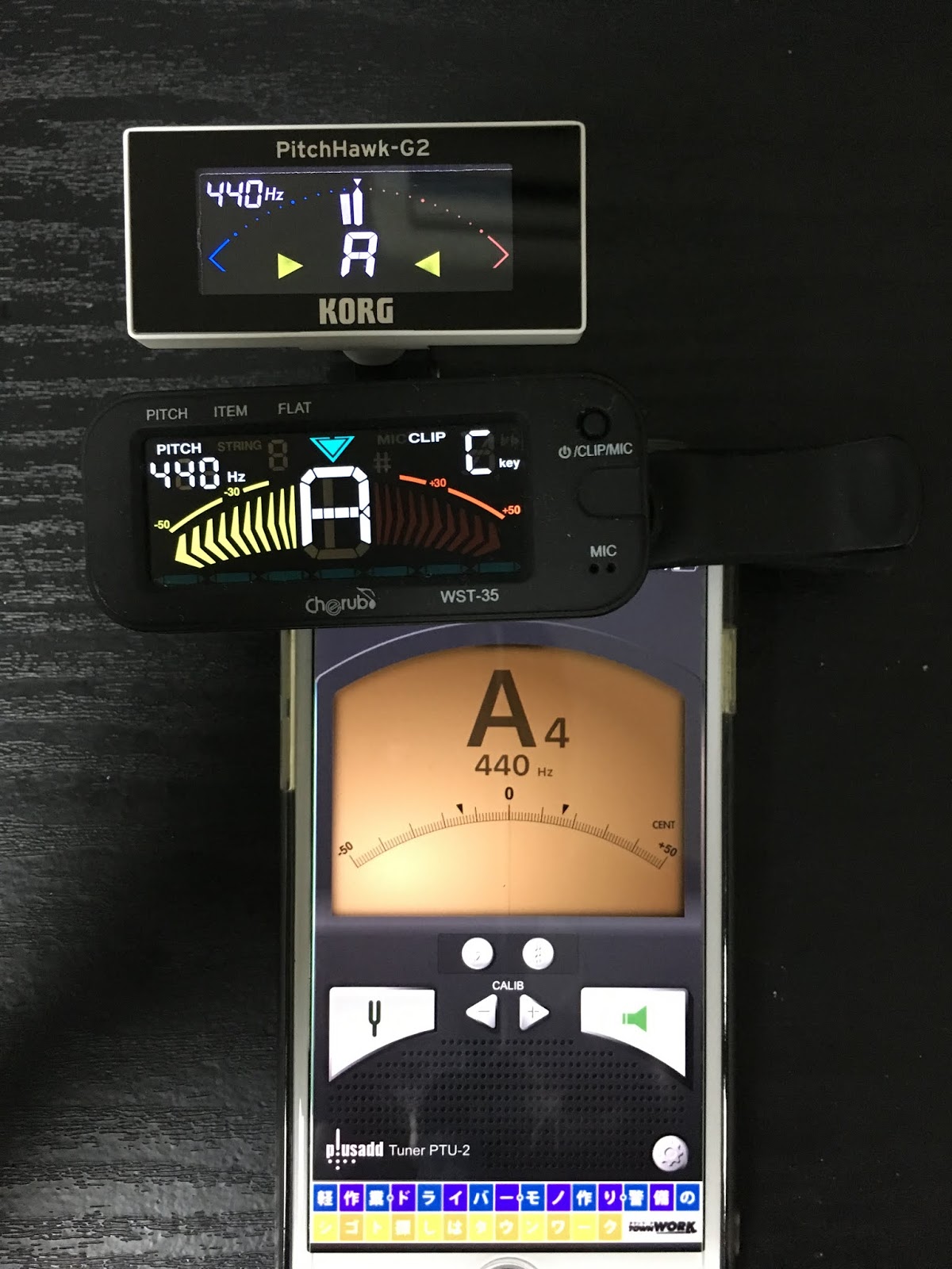 iPhoneに挟んで、アプリのチューナーで音を出して比べてみます。
