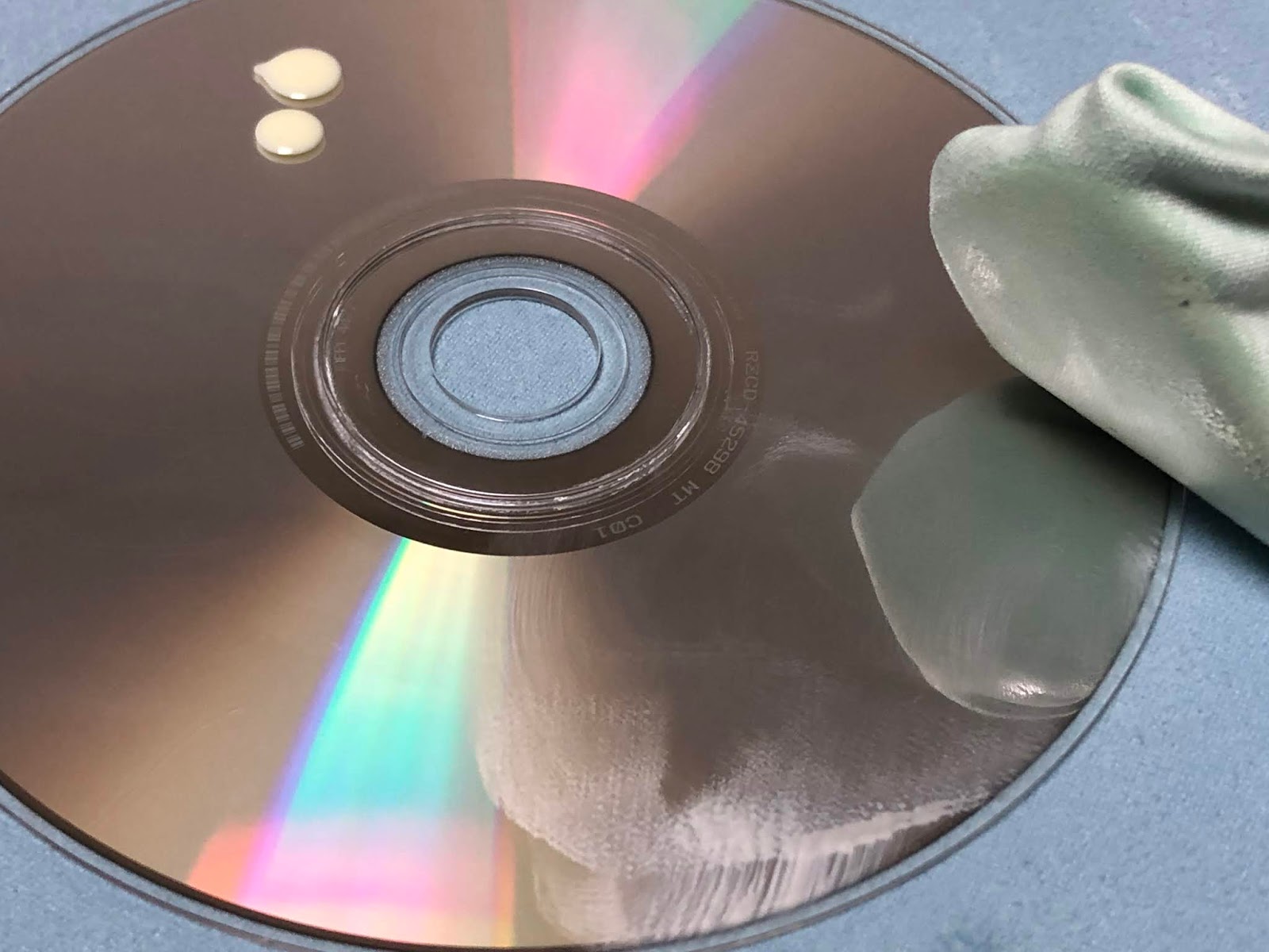 ディスクの文字が書かれているレーベル面を傷めないように下に布を敷きました。
