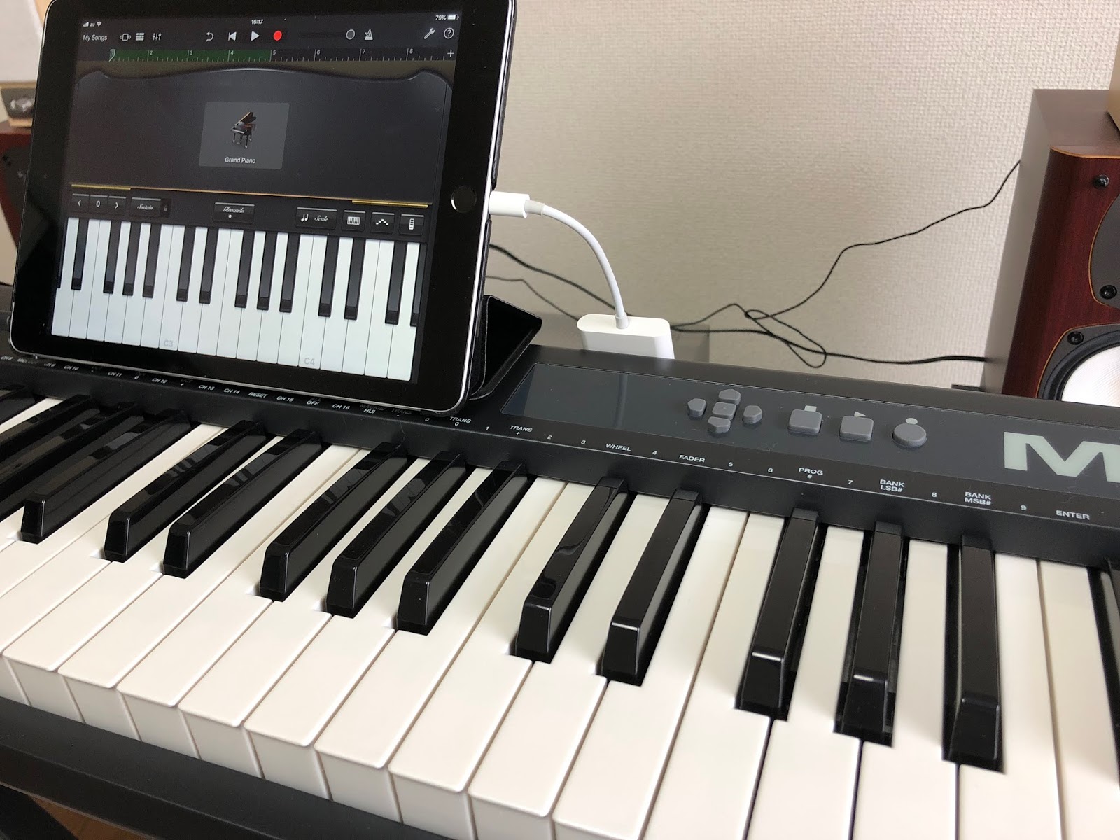 上の画像ではiPadからライトニング-USBカメラアダプタなるものを介してKEYSTATION88と接続しています。