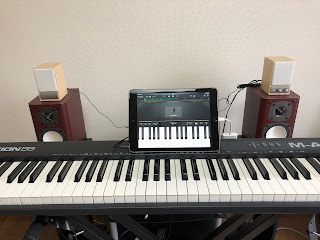 さらにiPadとマルチメディアスピーカーを接続して簡易的なピアノ環境が構築できました!