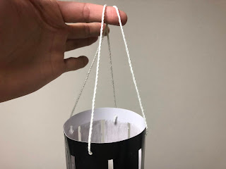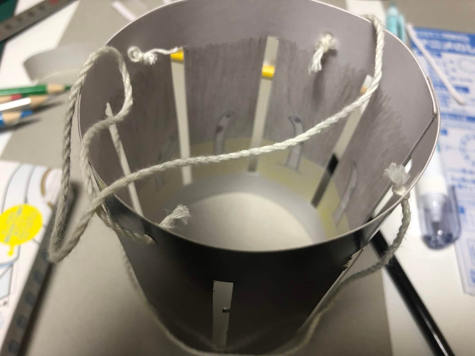 四角シートに絵をかいて点線部分を切り取り丸めてひもを付ける。