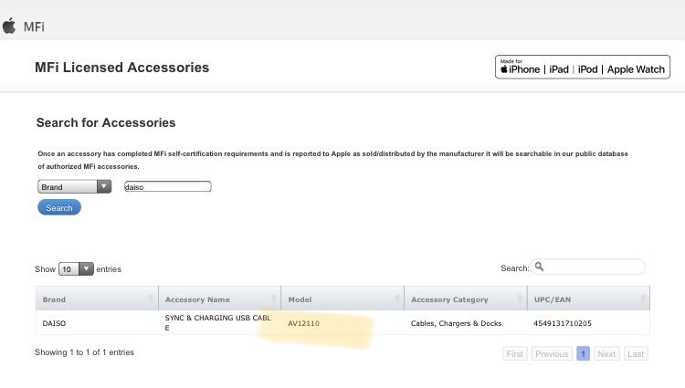 こちらの製品、本当にMFi認証されているかアップルのサイトで確認すると…