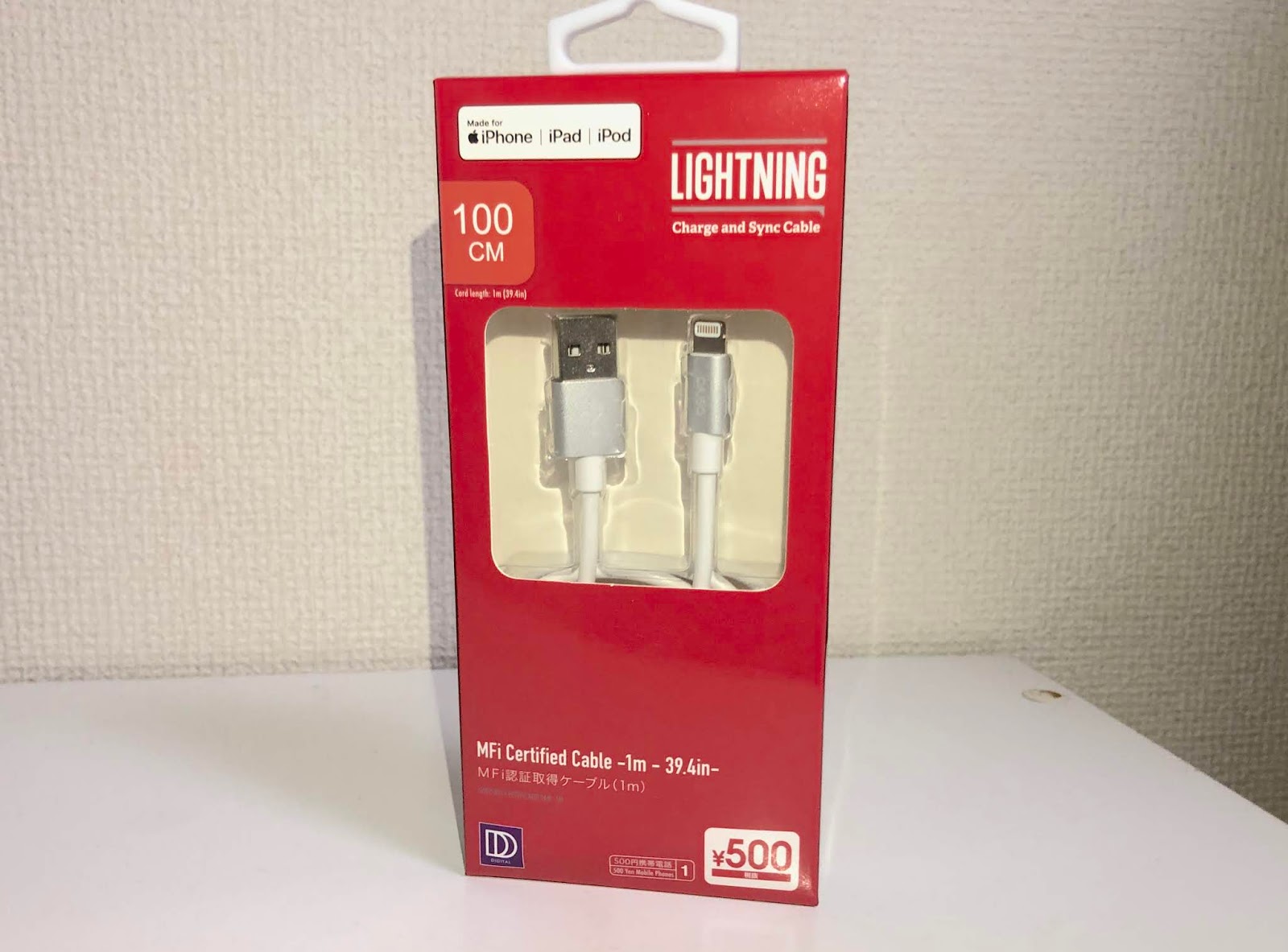 大手100円ショップ、ダイソーにて販売されていた(税別)500円のiPhoneやiPad用のライトニングケーブルを入手しました。